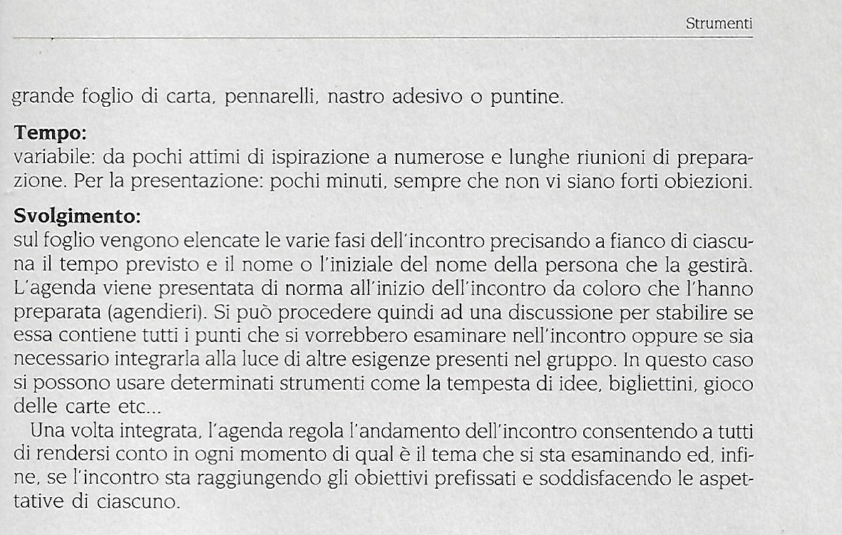 In principio, però, gli scarti tra agenda e sua realizzazione erano appena tollerati. Proprio per la suddetta funzione comunicativa circa il programma previsto dai trainers (che se l’agenda serviva per la gestione di una riunione di lavoro erano gli agendieri). Ma anche per altre esigenze, come nell’esperienza del training di Porto Pino. Allorchè, essendo in quattro a condurlo, ciascuno di noi aveva in consegna un sottogruppo dei numerosi partecipanti. In questo caso l’agenda convenuta doveva essere osservata con una perfetta sincronia, cosa che non sempre avvenne. Col crearsi di tempi morti per il o i sottogruppi che terminavano puntualmente la prevista fase di lavoro.