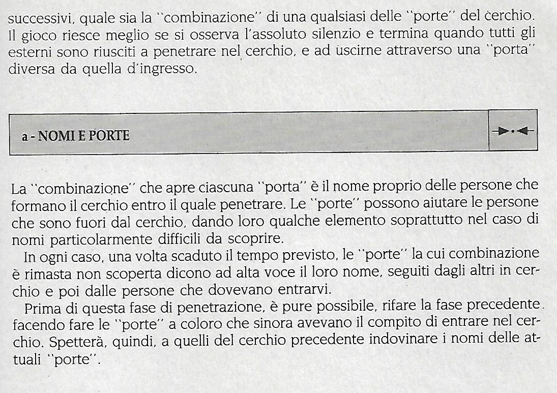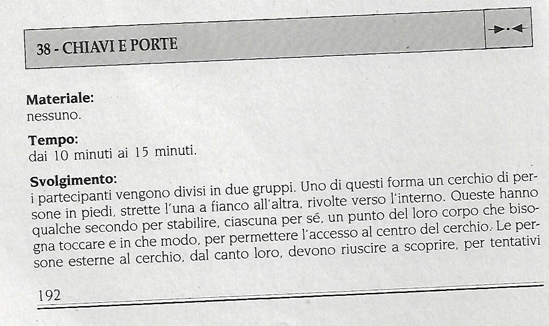 Il gioco che presentiamo oggi, dal titolo Chiavi e porte con la sua variante Nomi e porte (vedi sotto) ci sembra molto adatto per trattare in modo più poetico l’argomento dell’assertività. Naturalmente non è l’unico nell’ampio campionario di strumenti presente nei nostri manuali. Tuttavia, possiede quel carattere metaforico necessario perchè un gioco possa rientrare in una ipotetica agenda sul tema. Come vedremo dopo, infatti, l’assertività si compone di un insieme di qualità personali che rendono chi le possiede ben in grado di vivere con spirito aperto e creativo, non difensivo, la fase di storming del gruppo. E ciò pure nel caso in cui dovesse essere l’unico ad averle.