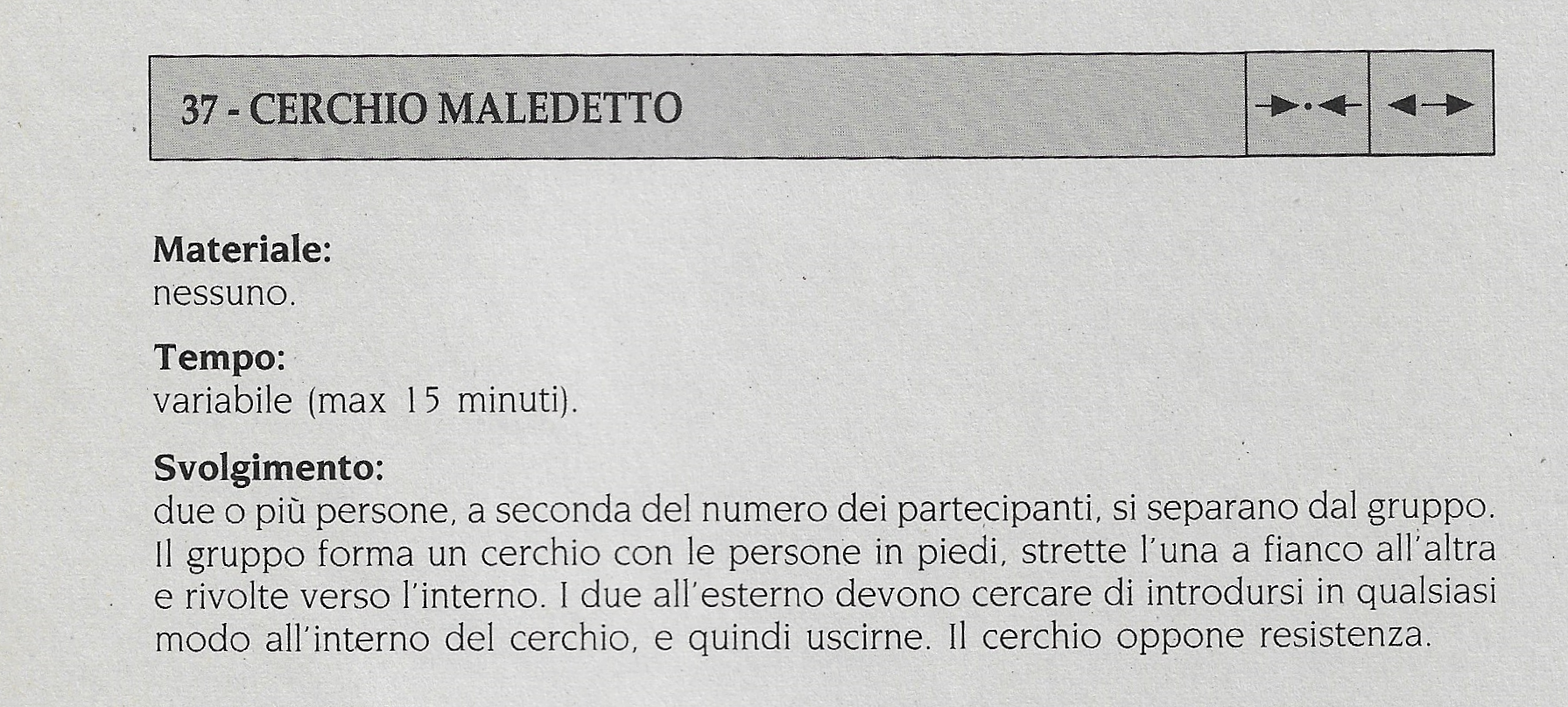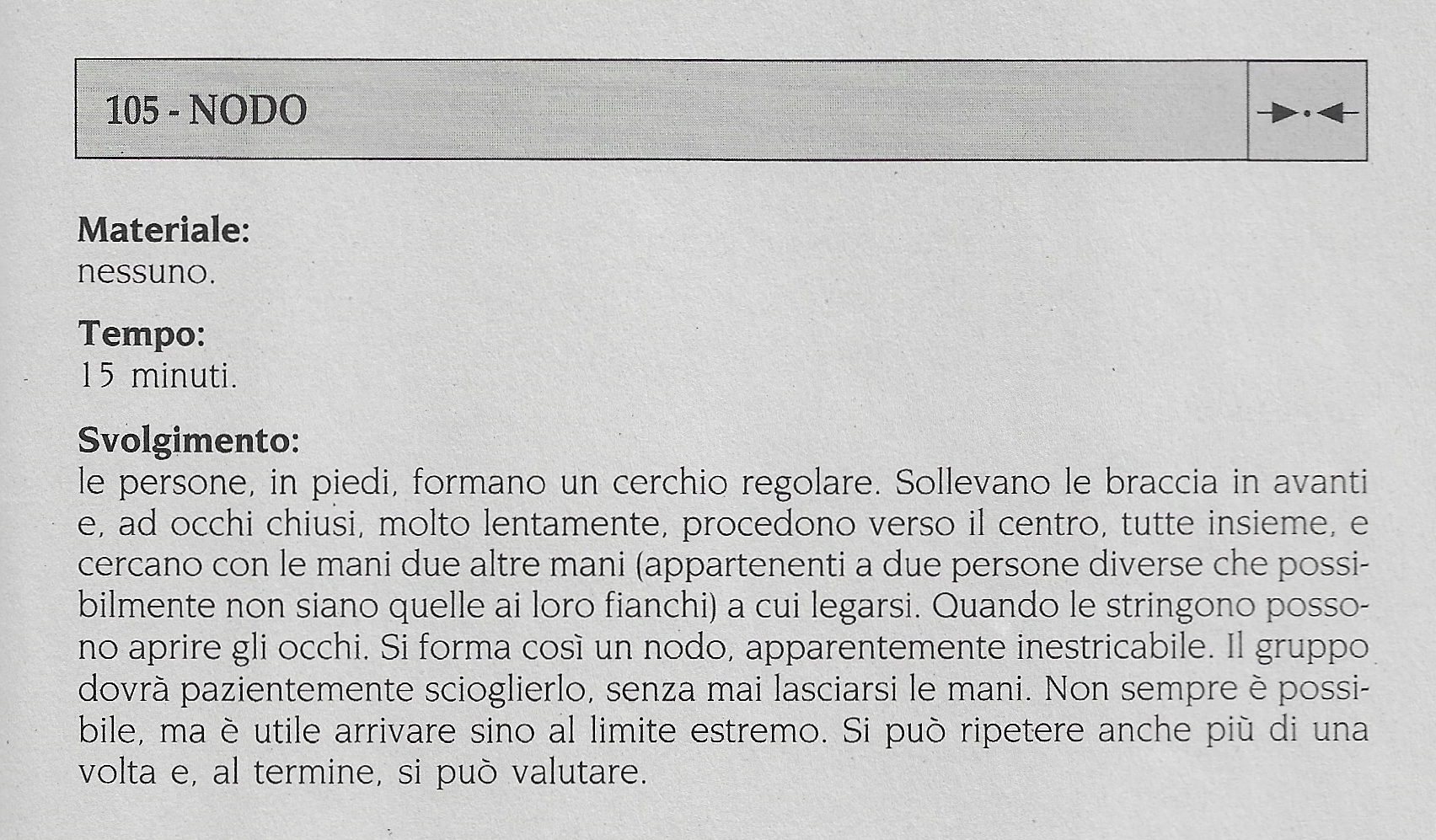 Lo facciamo con Cerchio maledetto, vedi sotto, che in un ipotetico percorso di addestramento al problem solving, potrebbe essere associato ad un altro bellissimo strumento, Nodo (vedi sempre sotto), molto adatto per condizioni diverse da quelle purtroppo imposte oggi dalla pandemia.