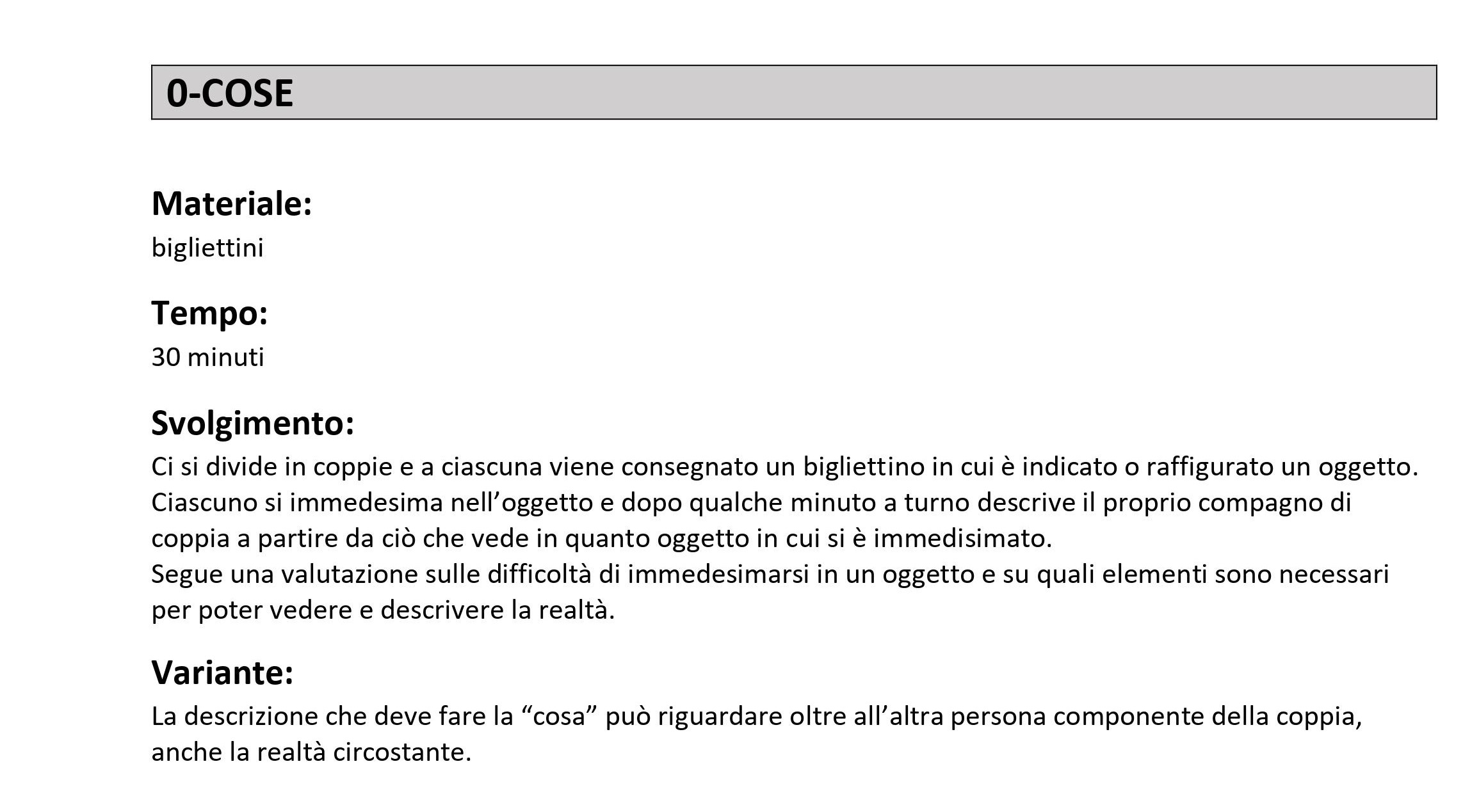 Lo abbiamo immaginato sia per spiegare ancora meglio l’utilità del gioco in generale. Cioè che in concreto è in grado di spiegare molto meglio di mille parole. Che, riferendoci al gioco nello specifico, per suggerire l’idea che immedesimarsi in una cosa, con buona pace di quel tipo di identificazione che sta alla base dell’alienazione marxiana, può aiutare a conoscere meglio se stessi. In fondo nella gamma dei giochi dei nostri manuali, tantissimi sono basati sull’immedesimazione in animali. Pochissimi in cose. Perlopiù gli oggetti, previsti tra i materiali utili allo svolgimento dei giochi, servono per mettere in relazione i partecipanti. Nulla di più.
