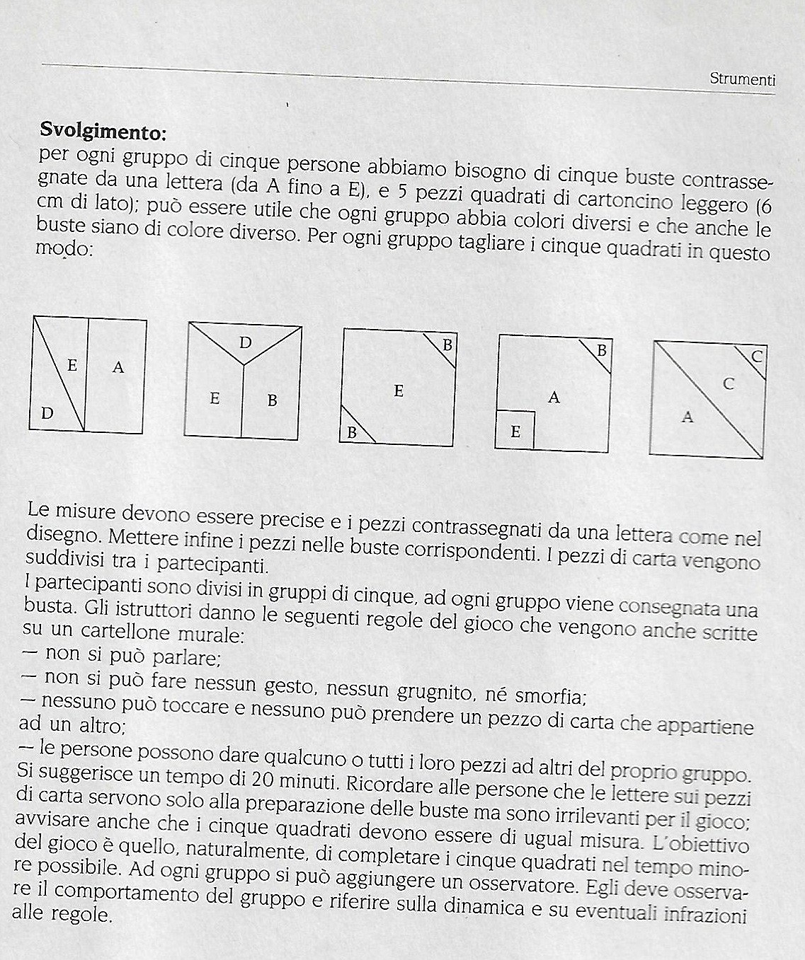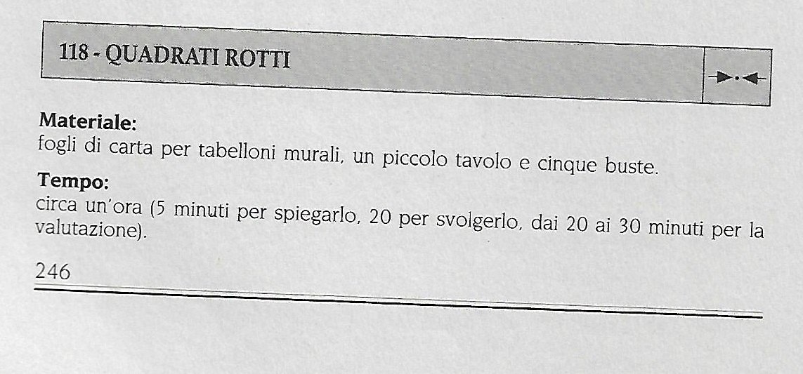 Naturale sviluppo di Tamgram è l’esercizio che esponiamo alla fine del brano dal titolo Quadrati rotti. Dal collegamento tra i due scaturisce la seguente domanda: la creatività è conciliabile con l’efficienza?