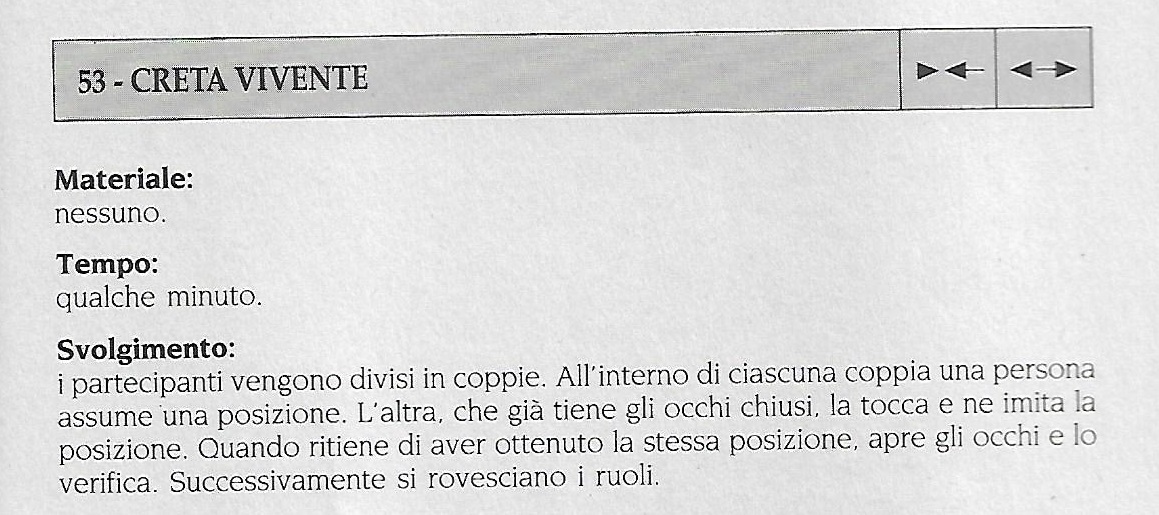 La prima parte del titolo del brano di oggi, Creta vivente piedi di argilla, è il titolo di un altro semplice quanto importante gioco del nostro patrimonio ludico: Creta vivente (vedi sotto). Esso vuole simboleggiare la malleabilità di ciascuno di noi di fronte alle sollecitazioni efficaci.