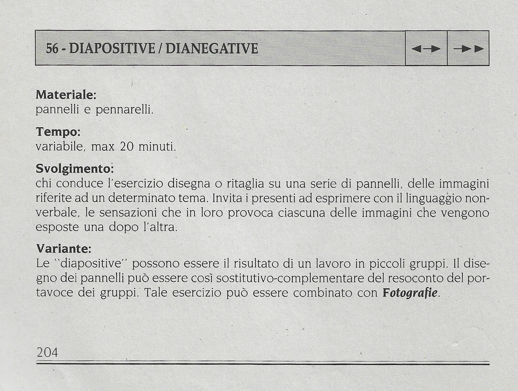 Il brano di oggi è dedicato all’omonimo gioco Diapositive/Dianegative (vedi sotto). Strumento molto versatile di cui nel tempo abbiamo introdotto una variante. Consistente nella semplice esposizione di un’immagine, di un brano sintetico (un aforisma ad esempio) e conseguente invito ai partecipanti alla sessione di lavoro, ad esprimere i loro pensieri. Od anche a formulare un titolo espressivo. Una didascalia.