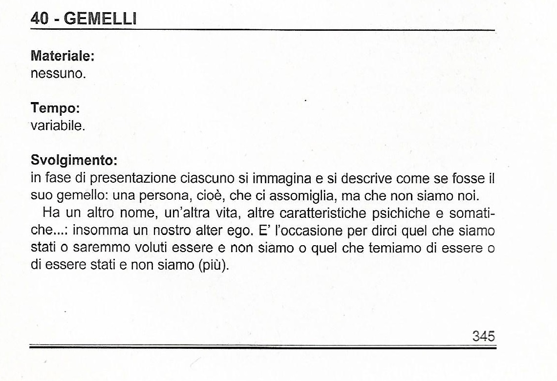 Dal testo Reti di formazione alla nonviolenza, Torino 1999, proseguiamo l’esercizio illustrato nel brano precedente. Apriamo il libro e leggiamo il primo gioco che ci capita sotto gli occhi: Gemelli (vedi sotto).
