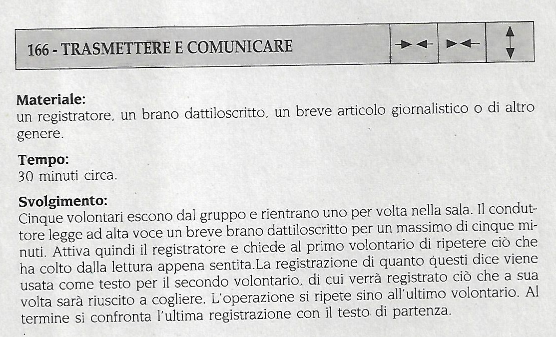 Il gioco che proponiamo mette infatti a nudo le difficoltà ad incamerare dati ed informazioni per poi riferirle ad altri, e mostra come i vuoti siano destinati ad essere riempiti con contributi inauditi (nel senso di non uditi), frutto di nostri tratti personali e al limite del rapporto tra ciò che ricordiamo e ciò che dobbiamo rendere coerente per un discorso trasmissibile. Non a caso tale esercizio svolge un ruolo importante nell’apprendere ad apprendere. Se vogliamo riuscire a ricordare dobbiamo dare un senso logico alle informazioni. E ciò non solo individuando il filo rosso che le lega, mai del tutto coglibile a priori, ma soprattutto quello che sa tessere l’ascoltatore. Con chiara necessità di fare riferimento ai contenuti essenziali dell’ermeneutica. Che da tecnica di interpretazione di un testo è opportunamente diventata l’arte di costruire il puzzle in cui si presenta la realtà.