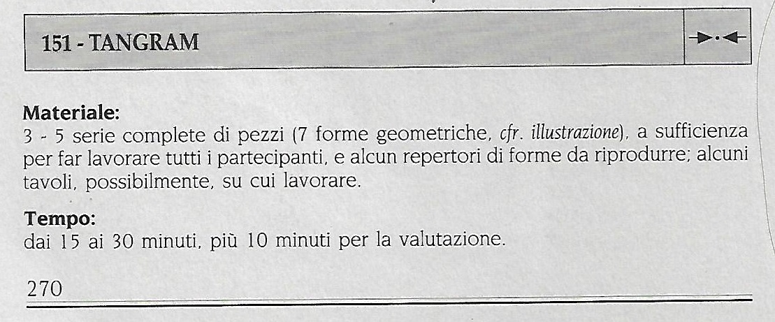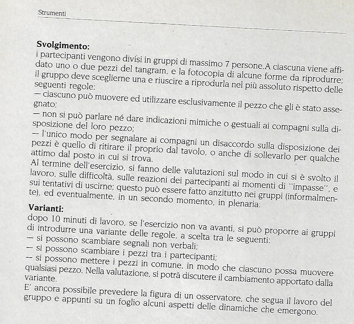 In perfetta continuità con i giochi nonverbali e con quanto esposto nel brano Jazz band, è ora la volta di Tamgram (vedi alla fine). Strumento dai mille usi e particolarmente consigliato per una vasta gamma di finalità tematiche: dall’educazione alla comunicazione, sino all’esercizio della leadership all’interno del gruppo. Passando per l’analisi delle dinamiche di gruppo. Tema per il quale ci sembra possibile accostare Tamgram al T-Group. Cogliendo così l’occasione per tributare la nostra riconoscenza ad Enzo Spaltro a poche ore dalla sua scomparsa. Autore cui il gruppo training di Cagliari deve non solo gli insegnamenti dei suoi innumerevoli testi, alcuni citati nei nostri manuali. Ma anche quelli più diretti, offertici con la sua presenza in Sardegna. Ed in particolare in una specifica occasione, risalente al 2003, in cui fece, in team con Milena Ambrosini, un uso particolarmente interessante del T-Group. Proprio per permetterci, appunto, di analizzare le dinamiche del nostro gruppo.